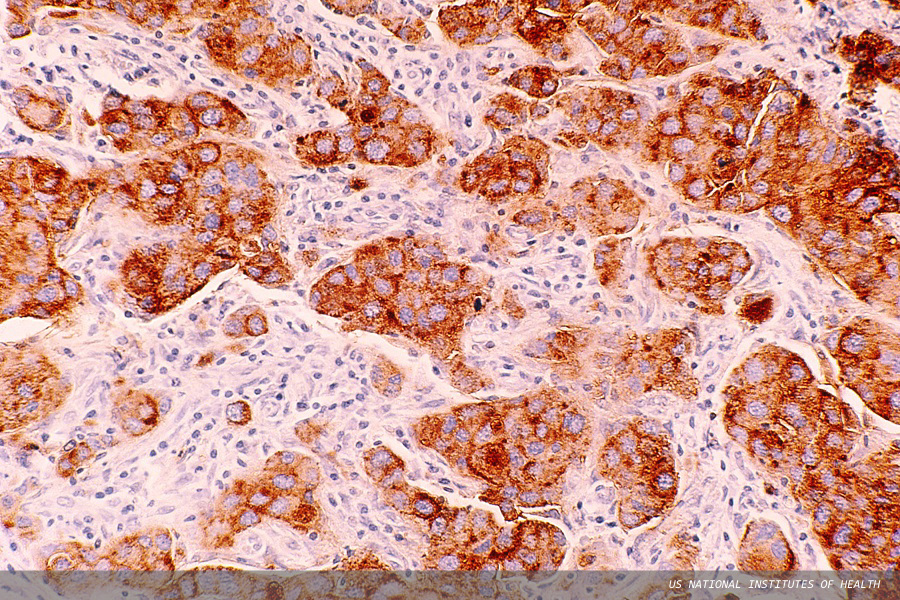 Pictured is an infiltrating ductal carcinoma of breast. The cytoplasm of the tumour cells is stained brown using an immunohistochemistry method to detect carcinoembryonic antigen (CEA).