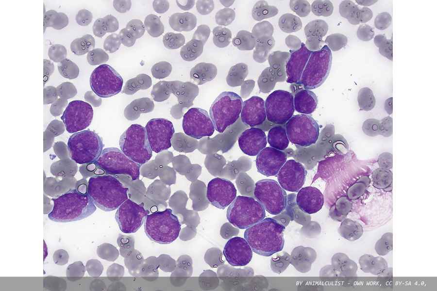 Pictured is a bone marrow aspirate smear from a person with precursor B-cell acute lymphoblastic leukaemia (Wright's stain).