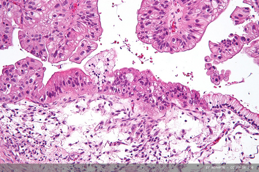 The therapy is designed to destroy both cancer cells and cancer‑associated fibroblasts – supportive cells inside the tumour that help it grow and protect it from the immune system. By breaking down these cells, the treatment may make tumours more vulnerable and easier for the immune system to target. Pictured above is micrograph of a low malignant potential (LMP) mucinous ovarian tumour, (haematoxylin and eosin [H&E] stain).