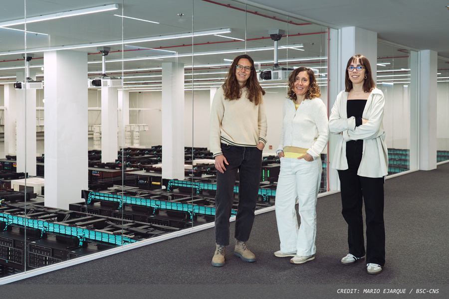 To manage, process, and analyse a volume of data of this magnitude, the scientific team required the use of advanced computational methods that had never been applied to such complex data sets, with the MareNostrum 5 supercomputer as a key piece to make possible a study that would not have been viable without high-performance computing infrastructure. Pictured are BSC researchers and study authors (left – right) Aida Ripoll-Cladelles, Marta Melé and Maria Sopena-Rios, in front of the MareNostrum 5 supercomputer.